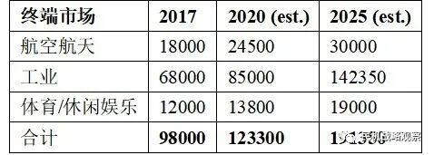 表 2 全球碳纤维市场对碳纤维的需求(数据来源:AJR公司)
